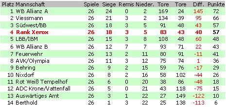 Rank Xerox - Viessmann 3 - 3 Spielbericht Rank Xerox - Nixdorf 4 - 2 Spielbericht Berthold - Rank Xerox 0 - 6 Spielbericht Behring - Rank Xerox 1 - 3 Spielbericht Rank Xerox - RW Tempelhof 2 - 1 Spielbericht Rank Xerox - Feuerwehr 6 - 0 Spielbericht Südwest/BB - Rank Xerox 3 - 2 Spielbericht Rank Xerox - Allianz B 2 - 1 Spielbericht Auswärtiges Amt - Rank Xerox 1 - 7 Spielbericht Rank Xerox - Allianz A 0 - 6 Spielbericht Krone/Vattenfall - Rank Xerox 1 - 6 Spielbericht RW Tempelhof - Rank Xerox 0 - 1 Spielbericht Rank Xerox - AVK Olympia 3 - 2 Spielbericht Allianz B - Rank Xerox 3 - 3 Spielbericht Rank Xerox - LBB/IBM 2 - 1 Spielbericht Allianz A - Rank Xerox 6 - 1 Spielbericht AVK/OLympia - Rank Xerox 4 - 0 Spielbericht Rank Xerox - Südwest/BB 1 - 1 Spielbericht Rank Xerox - Auswärtiges Amt 5 - 0 Spielbericht Rank Xerox - ADC/Krone 3 - 1 Spielbericht Nixdorf - Rank Xerox 2 - 5 Spielbericht LBB/IBM - Rank Xerox 2 - 1 Spielbericht Feuerwehr - Rank Xerox 2 - 4 Spielbericht Viessmann - Rank Xerox 0 - 1 Spielbericht