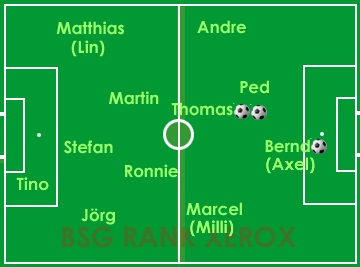 Diesmal war von der Dominanz der Blau-Weiß wenig zu sehen. Obwohl der Gastgeber frühzeitig in Führung ging, zeigten wir uns wenig geschockt und schossen unbeeindruckt zurück: Bernd und Pat drehten vorübergehend das Ergebnis, ehe die Hausherren noch vor der Pause den Ausgleich erzielten. Nach der Pause erwischte uns Allianz noch im Halbschlaf, als unsere Abwehr nicht entschlossen genug klärte und dem Gegner so die erneute Führung ermöglichte. Es dauerte einige Minuten bis wir uns wieder fanden und Pat mit seinem 2. Tor abermals den Gleichstand herstellte. Die Partie blieb bis zum Ende ausgeglichen und der Ausgang völlig offen. Die besseren Chancen besaßen evtl. sogar wir, doch was hilft das schon, wenn der Ball nicht ins Ziel trifft... So mussten wir letztlich (erwartungsgemäß ) die erste Saisonniederlage einstecken!