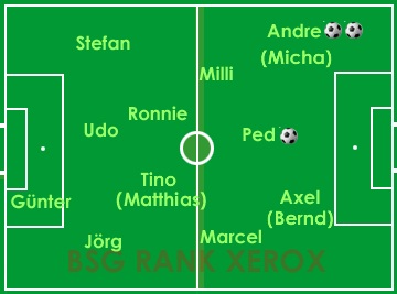 Das Trainergespann vertraute im Wesentlichen der Aufstellung aus der Vorwoche (nur unser etatmäßiger TW Günther kehrte wieder zwischen die Pfosten zurück, Tino rückte dafür als Abräumer vor die Abwehr und André vertrat Lin im Angriff) und das Team rechtfertigte die Maßnahme.