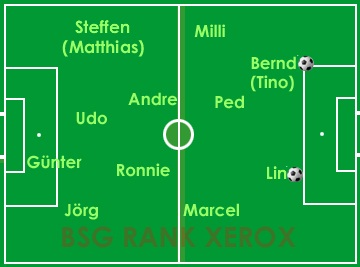 Wenngleich es eigentlich unangemessen wäre, aus unserer Mannschaft einzelne Spieler hervorzuheben, sollten die Verdienste von unseren beiden "Sechsern" Andre und Ronny besonders gewürdigt werden, die im defensiven Mittelfeld zugleich Abräumer und Antreiber waren, viele Lücken stopften und oftmals in brenzligen Situationen am rechten Fleck standen, dort mit letztem Einsatz klärten.