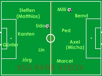 Auch gegen die Bundesdruckerei liefen wir den Gegenspielern oft hinterher, waren wir den quirrligen Angreifern häufig nicht gewachsen und verloren insgesamt einfach zu viele Zweikämpfe. Dazu gesellten sich fatale Fehler in der Abwehr bzw. im Spielaufbau. Fahrlässige Ballverluste und dumme Abspielfehler führten zu vermeidbaren Gegentreffern. - So dauert die Krise weiter an, wenngleich winzige Lichtblicke zu verzeichnen waren: Udo feierte nach ber 10-monatiger Verletzungspause sein Comeback in der Startelf und erzielte sogar ein herrliches Tor (Volleyschuß aus 16m). Doch um aus der Talsohle entfliehen zu können, bedarf es mehr - vor allem Geduld und Zuversicht!
